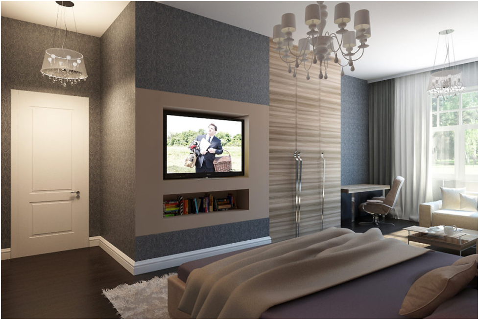 Настенное расположение телевизора также позволяет сэкономить квадратные метры, что особенно важно для небольших спален.