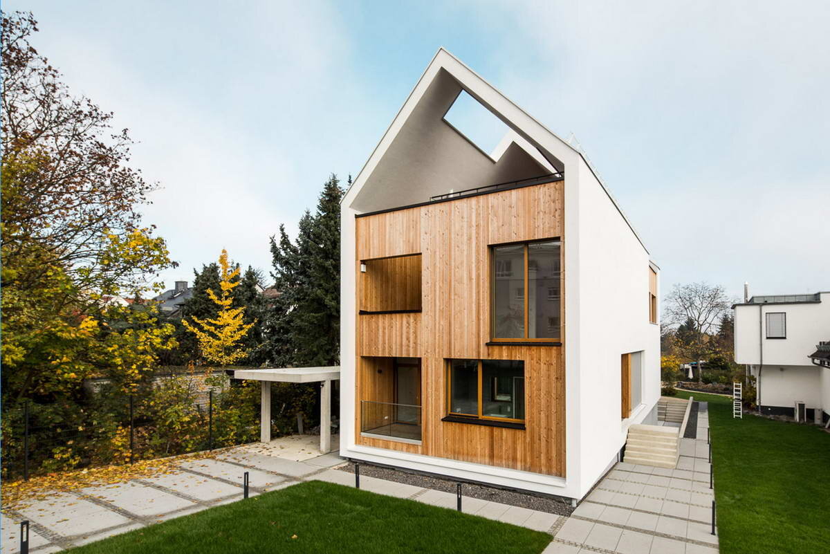 Узкое вытянутое здание стало результатом тщательного изучения особенностей участка (от тоже узкий и длинный) и традиционных архетипических домов с острой двухскатной крышей вокруг.
