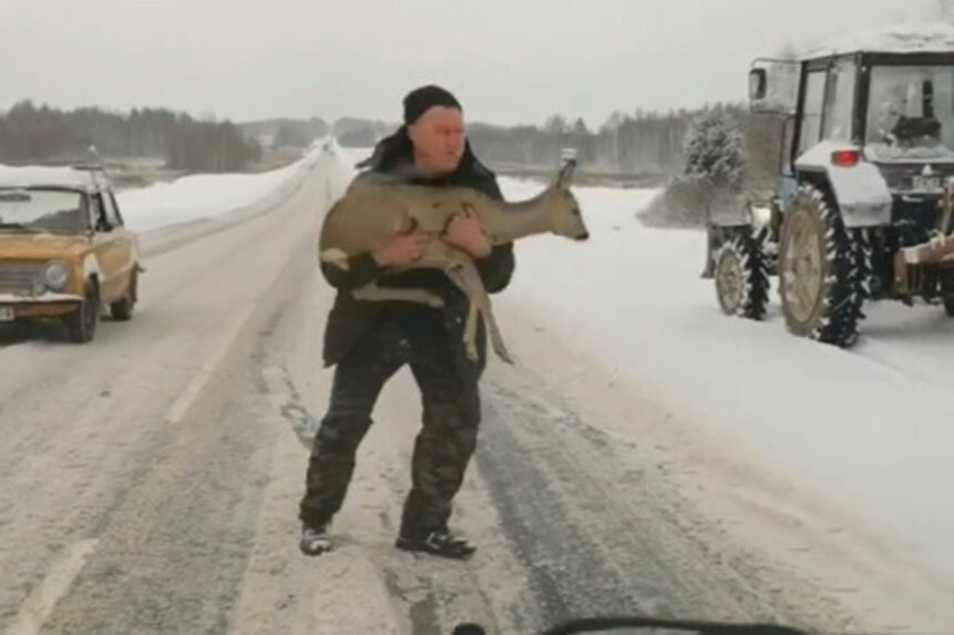 Доброе видео: тракторист на руках унес с дороги косулю, чтобы ее не сбила машина