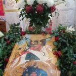 Затем началась Божественная литургия, которую совершил настоятель храма протоиерей Игорь Жевердан в сослужении настоятеля Покровского храма сл. Никольской иерея Георгия Лукащука, настоятеля храма в честь Успения Пресвятой Богородицы сл. Мальчевской Владимира Молородова, клирика Нежинской епархии священника Александра Тимошенко, дьяконов Ростовской епархии и Кашарского благочиния.