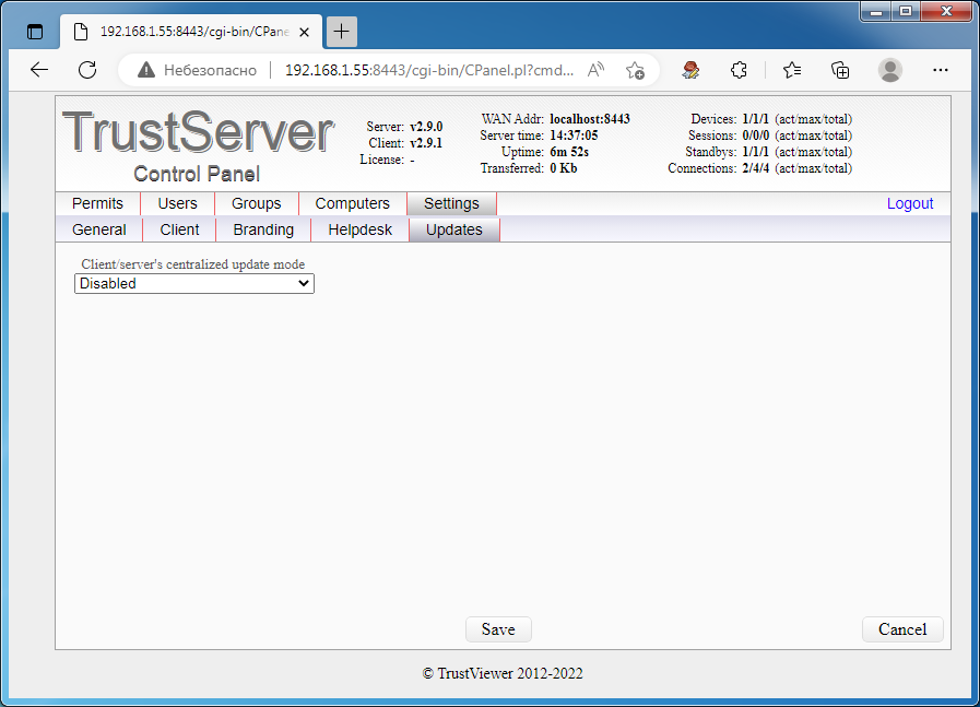 В нем также есть информационные поля Current TrustServer version и Current TrustViewer version, показывающие текущие версии сервера и клиентских модулей, а также параметр Waiting for an update in queue, устанавливающий время очереди на ожидание обновления.
