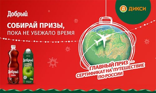 3. Выигрывайте сертификат на путешествие по России и другие призы. В акции участвуют напитки безалкогольные газированные под товарным знаком «Добрый» в объеме 0,33 л., 0,5 л., 1 л., 1.5л., (все вкусы), соки и нектары под товарным знаком «Добрый» в объеме 0,3 л., 0,95 л., 1 л. и 2 л. (все вкусы) и напитки безалкогольные энергетические под товарным знаком «BURN» («БЁРН») в объеме 0,449 л. (все вкусы). Призовой фонд: