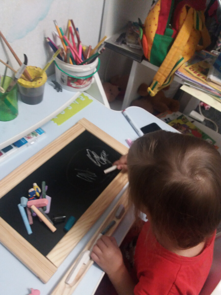 Вчера после работы сын пригласил в гости. Захватила приготовленный пакет с настольной досточкой (планшет) для рисования мелом (или лепки на нем пластилином) и скорее поехала к ним. Внучка меня не встретила (обычно встречает с кромкими радостными криками), а на тот момент-нет. Она смотрела мультфильм в папином ТЕЛЕФОНЕ. Большая удача для неё, так как телефон ей дают очень редко. Вещи определила на место в прихожую, помыла руки и, взяв пакет шагнула в комнату... Внученька лежала на кровати и с интересом смотрела на экран телефона... -смотри, что я тебе принесла?! С недоверием глаза внучки посмотрели в мою сторону (ведь правда, что может быть интереснее мультика в папином телефоне?) -что это? -планшет. Рисовать. Лепить... Договорить я не успела-планшет уже был схвачен в плен и перемещен в комнату на столик. -сейчас, Бабуля, вот сюда надо разложить мелки! Схватив мелки, выложила их в пенал и побежала за следующей "порцией"... -но в пенале уже нет места?! -но ведь можно сюда! И... водрузи