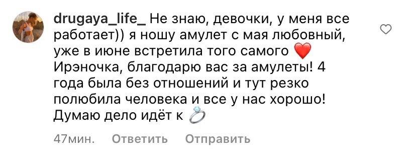 Амулет «Энергия любви» помог более 5 тысячам людей поднять свой уровень энергии любви, а вследствие этого — обрести любовь к себе, найти партнера и избавиться от одиночества! Истории, которые это подтверждают: Одна из моих подписчиц была без отношений целых 4 года. Но спустя месяц ношения амулета «Энергия любви» встретила своего мужчину и готовится к свадьбе с ним! Другая подписчица, благодаря амулету «Энергия любви», смогла выйти из отношений, в которых ее не ценили. Она встретила человека, который разглядел в ней ЖЕНЩИНУ! УЗНАТЬ ПОДРОБНЕЕ О ДЕЙСТВИИ АМУЛЕТА Еще один благодарный отзыв о работе амулета «Энергия любви». С его помощью девушка за неделю привлекла в свою жизнь мужчину мечты. Они не могут поверить в такое счастье до сих пор! А этой моей клиентке амулет «Энергия любви» помог поверить в себя и быть на позитиве. Также она неожиданно получила шикарный букет от мужчины, которого видела всего раз в жизни в течение получаса! После того, как моя подписчица начала носить амулет «Эне