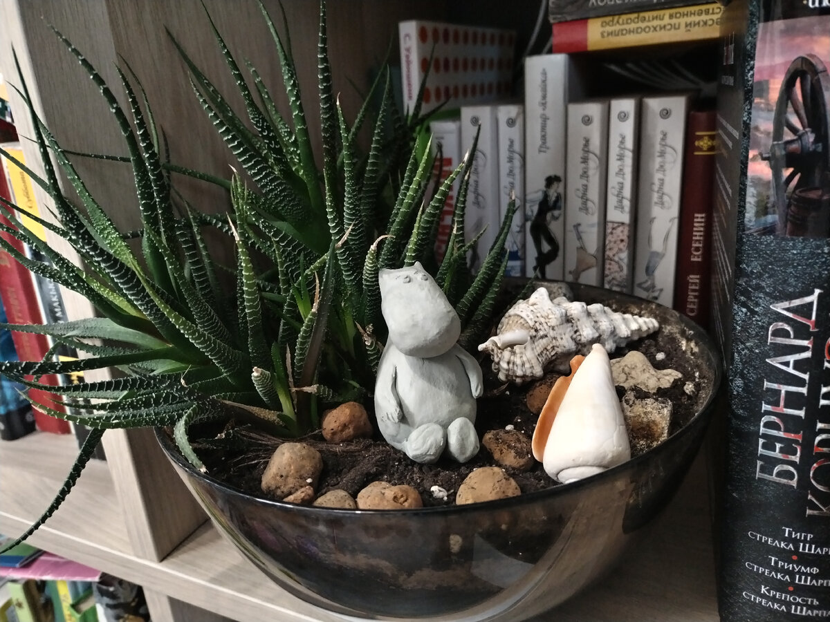 Я очень люблю сады - и книги про муми-семейство шведско-финской писательницы Туве Янссен. Именно поэтому даже на книжной полке у меня живет вот такой чудесник, которого в минуту задумчивости я слепила из глины: Глину я не обожгла, так что поливать приходится аккуратно, благо хавортия засуху переживает отлично. Кстати, про эту хавортию у меня есть одна история. Однажды началась пандемия... и мы уехали на полгода в деревню. Уезжали в спешке, но все цветы я пристроила - а про хавортию забыла. Ну вот забыла и все, стояла она не на подоконнике, а на столике, и как-то не попалась на глаза. И вот нас не было полгода. Потом мы вернулись, я увидела ее не сразу.. А когда увидела, поняла - все, конец. Но выбрасывать было жаль (она с детками занимала весь этот салатник, это сейчас я ее отчекрыжила и раздала). и я стала ее поливать и выхаживать. Не скажу, что я прирожденная медсестра от ботаники. Скорее, это заслуга этого невероятного растения! Оно выжило, пустилось в рост, снова дало деток... В о