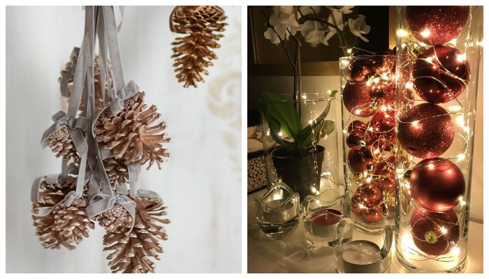 Новогодний декор, сделанный своими руками, ценен вдвойне, его можно преподнести в качестве презента родным и близким людям, а также украсить им свой дом, добавив уютную праздничную атмосферу. Давайте вместе с вами рассмотрим очаровательные идеи новогоднего декора, который можно сделать своими руками. Елочные шишки — отличный вариант, которым можно украсить дом, квартиру, обеденный стол, входные двери, подоконник и еще много чего другого. С помощью клея-пистолета к основанию шишек можно приклеить атласную ленту, канат или плотную нить, на которой впоследствии будет висеть украшение. Чтобы шишка смотрелась максимально выразительно, ее можно декорировать разноцветными мелкими помпонами. Подсвечник своими руками для новогоднего стола получится благодаря деревянному основанию, на которое приклеиваются шишки, яркие ягоды, веточки ели, орехи. Чтобы подсвечник приобрел завершенный вид, всю композицию можно припорошить искусственным снегом или же блестками. Достаточно свернуть ветку искусственн