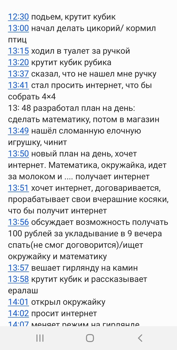 - Я целый день делаю уроки и больше ничего не успеваю. - растроился мальчик. - А давай я буду записываю за тобой, что ты делаешь. - предложила мама. -Давай. 12:30 подьем, крутит кубик 13:00 начал делать цикорий/ кормил птиц 13:15 ходил в туалет за ручкой 13:20 крутит кубик рубика 13:37 сказал, что не нашел мне ручку 13:41 стал просить интернет, что бы собрать 4×4 13: 48 разработал план на день: сделать математику, потом в магазин 13:49 нашёл сломанную елочную игрушку, чинит 13:50 новый план на день, хочет интернет. Математика, окружайка, идет за молоком и .... получает интернет 13:51 хочет интернет, договаривается, прорабатывает свои вчерашние косяки, что бы получить интернет 13:56 обсуждает возможность получать 100 рублей за укладывание в 9 вечера спать(не смог договорится)/ищет окружайку и математику 13:57 вешает гирлянду на камин 13:58 крутит кубик и рассказывает истории из ералаша 14:01 открыл окружайку 14:02 просит интернет 14:07 меняет режим на гирлянде 14:08 окружайка (15 мин