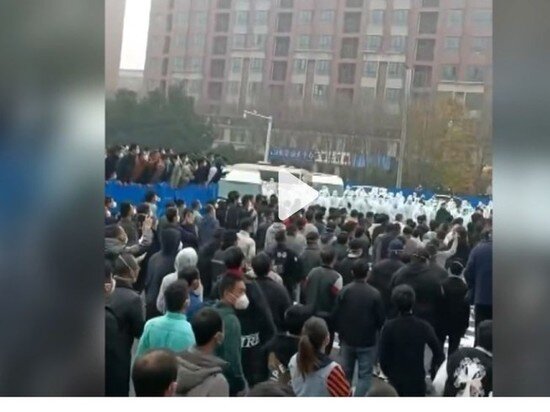 По Сети распространилось видео, где рабочие крупнейшего в Китае завода по сборке iPhone начали столкновенияс полицией, некоторые из них были в защитном снаряжении. На видео видно, как сотни рабочих противостоят сотрудникам правоохранительных органов, многие из которых одеты в белые защитные костюмы, в кампусе Foxconn в центральном китайском городе Чжэнчжоу. На кадрах, можно услышать, как некоторые протестующие жалуются на свою зарплату и санитарные условия. Это произоiло после того, как китайские государственные СМИ сообщили , что более 100 000 человек зарегистрировались для заполнения вакансий, объявленных в рамках масштабной кампании по набору персонала, проводимой на заводе Foxconn в Чжэнчжоу. Автор: Олег Тимофеев