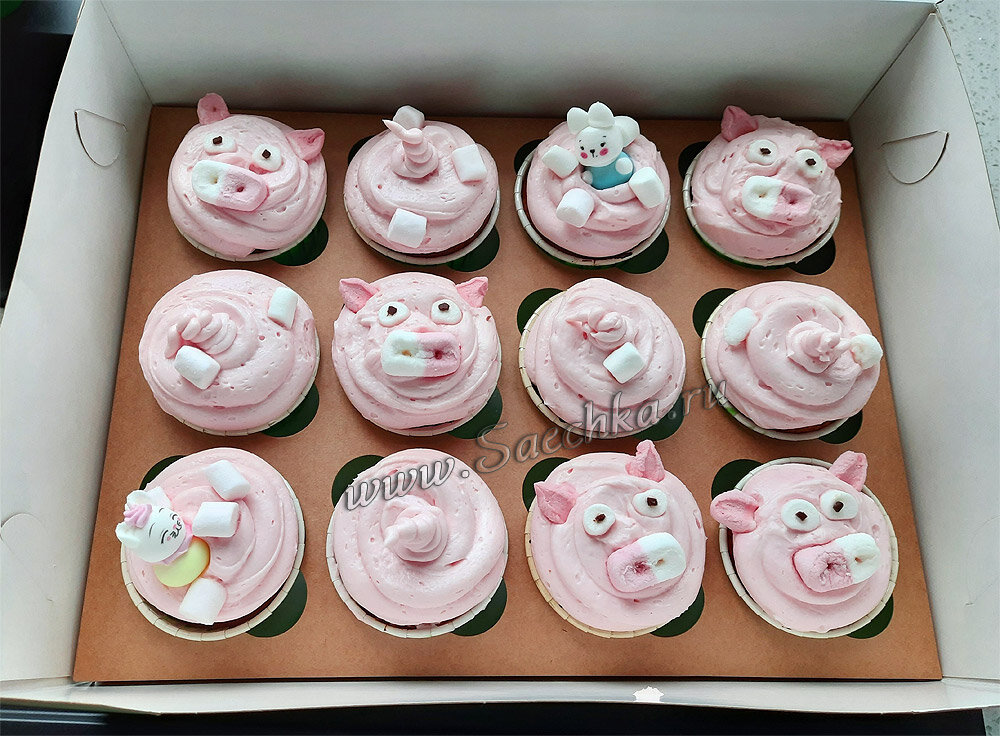 - Украсить капкейки в виде свинок и поросячьих хвостиков. В качестве глазок и пятачков использовать бело-розовый маршмеллоу.
