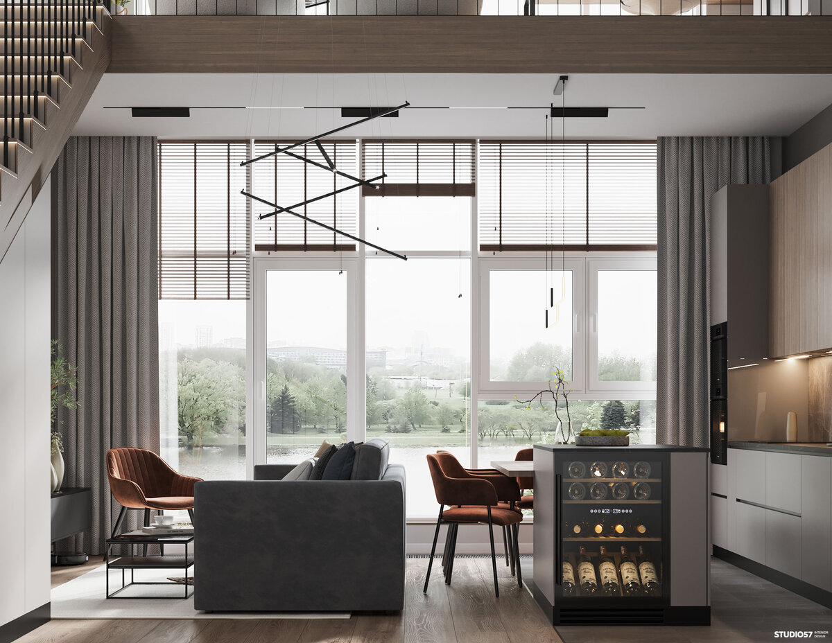 Сегодня рассказываем о квартире 105 м2, дизайн-проект которой разрабатывался для семьи с ребенком. Квартира двухуровневая с панорамными окнами, из которых открывается прекрасный вид на парк и реку. Планировочное решение квартиры включает в себя следующие помещения: 1-й этаж: 2-й этаж: Интерьер разрабатывался в сдержанной цветовой гамме с сочетанием дерева и серых тонов. Среди пожеланий заказчиков было использование графичных элементов, черных деталей и неброских терракотовых акцентов. Прямая кухня выполнена в двух оттенках серого цвета с акцентом в виде деревянной текстуры на фасадах и темной текстуры камня на столешнице. На полу в зоне кухни плитка, которая визуально отделяет кухню от гостиной, а также более практична. Остров у нас необычный и как бы разделен на две части: рабочая зона плавно переходит в столовую. В торце острова, по пожеланию заказчиков, расположили винный холодильник, который стал отличным дополнением интерьера. Стулья - акцентного терракотового оттенка. В гостино