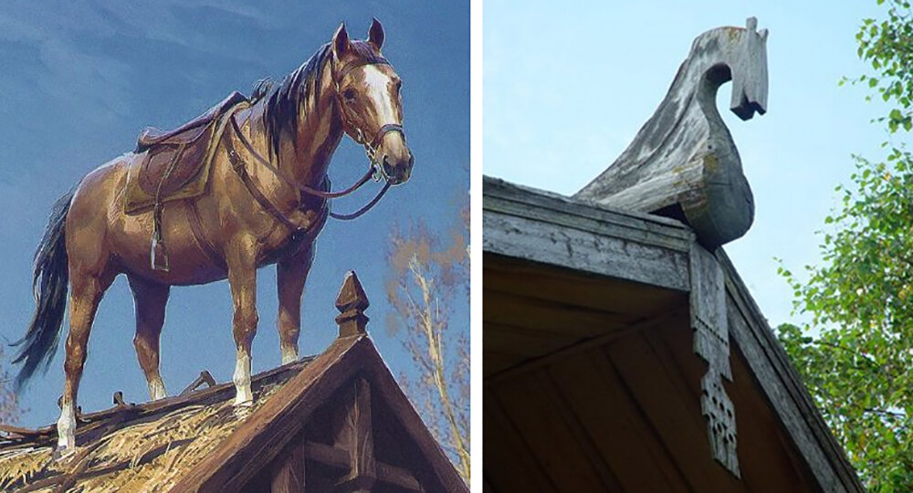 Конёк, конь, князь, князёк... Все эти названия в русском деревянном зодчестве относятся к скульптурному завершению венчающего крышу бревна-охлупня. Это завершение чаще всего изображало коня или птиц. Птиц на охлупне до наших дней дожило очень мало, коней - гораздо больше. Причина этого очень проста - выточенная из дерева тонкая птичья шея просто не выдерживает многовекового воздействия непогоды. У коня же и шея, и голова значительно толще и уже потому его фигурка на охлупне значительно долговечнее. И ещё одна причина - голова коня часто просто пристыковывалась к охлупню по системе паз-гребень (во-первых, не всегда удавалось найти подходящее бревно с соответствующим боковым отростком, а, во-вторых, даже если найдёшь такое бревно - попробуй его на крышу затащи). И теперь глядя на уцелевшую фигурку такого составного коня, Вы ни за что не угадаете какая по счёту голова венчает древний охлупень - третья, а может уже пятая? Но как бы то ни было, конь на крыше - это всегда красиво. И сегодня мы решили предложить вниманию любителей деревянной архитектуры небольшую коллекцию фотографий уцелевших коней, до сих пор венчающих крыши изб.