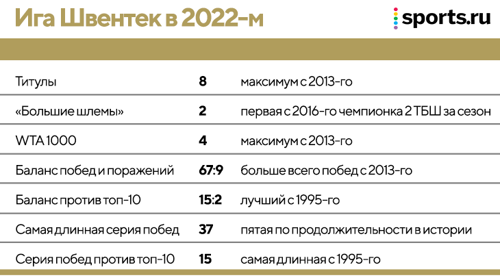 Первая ракетка мира Ига Швентек провела исторический сезон. Статистика говорит сама за себя.