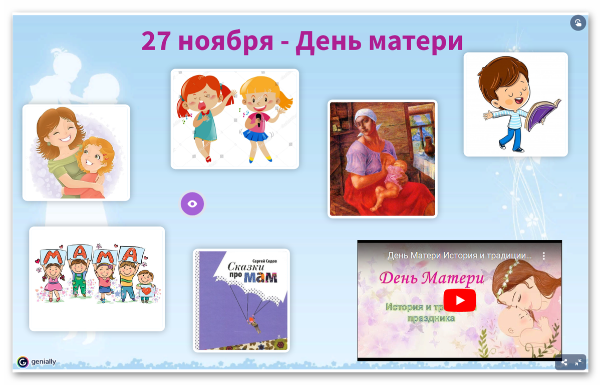 День матери – это замечательный трогательный праздник, который напоминает, что в жизни каждого из нас самый главный человек – это мама. Именно мама даёт нам жизнь. Мама окружает добротой, нежностью и заботой. Мама ведёт нас по длинной дороге взросления, поддерживая, наставляя на верный путь и оберегая от бед. Даже становясь взрослыми, мы ощущаем материнскую любовь, знаем, что мама всегда поймёт, простит и будет любить несмотря ни на что. Ко Дню матери библиотека подготовила онлайн-плакат «Сегодня мамин день», посмотрев который все желающие узнают об истории появления этого замечательного праздника, получат советы, как поздравить маму и что ей подарить, познакомятся с подборкой книг и кинофильмов, посвящённых мамам, разучат песни к маминому дню. Любители живописи посмотрят картины русских и зарубежных художников, главная героиня которых – мама.