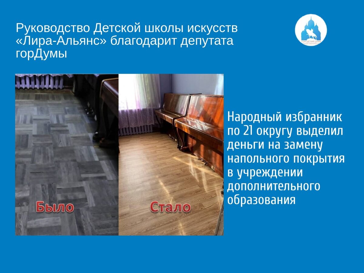 Ещё в июне этого года депутат горДумы обратился в администрацию казачьей столицы с заявлением о выделении управлению культуры и искусств 52 тысяч 642 рублей на приобретение напольного покрытия для подведомственной организации. По словам директора Детской школы искусств Елены Закалдаевой, обновление линолеума и напольной фурнитуры в двух образовательных кабинетах требовалось давно. «Инфраструктура образовательного учреждения является жизненно важным компонентом обучения. Сможет ли ребёнок сконцентрироваться на уроке, если его внимание будет привлекать дырка в стене или на полу? Обветшалый вид кабинета – не очень привлекательное место для обучения. Администрация школы искусств, преподаватели и родители выражают благодарность Андрею Андреевичу за понимание проблем школы», – прокомментировала руководитель учреждения дополнительного образования. Теперь, после проведённых ремонтных работ, воспитанники творческого и просветительского учреждения будут осваивать навыки игры на музыкальных инстр