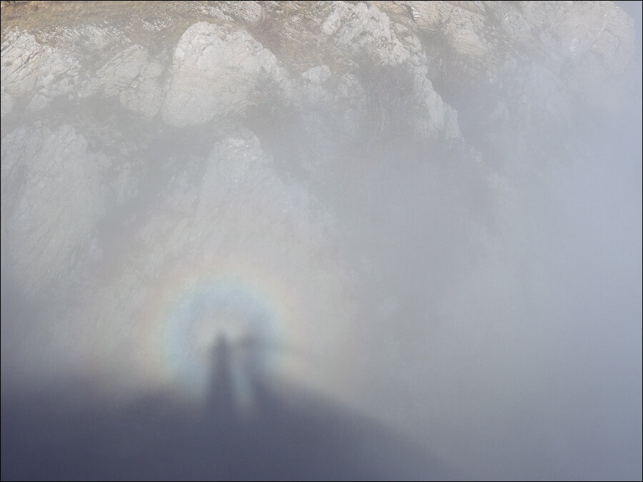 Белая, пронизанная солнцем облачная взвесь наполняла огромную каменную чашу у наших ног. И когда мы обошли её по краю и оказались спиной к солнцу — увидели горных призраков! Вокруг наших вытянутых синих теней в облаках плавали радужные гало — глория. Очень яркие, прозрачные — и одновременно объёмные. У каждого — своё, невидимое другому. А если раскинуть руки и взмахнуть ими — у теней вырастали длинные птичьи крылья… Зрелище было таким нереально-красивым, что мы втроём ещё долго торчали над обрывом, размахивая крыльями и разглядывая волшебные радужные нимбы. А по белому полю облаков выгибалась едва заметная, но несомненная, яркая — ярче белого — дуга. Это плавала в воздушно-облачной взвеси ещё одна радуга…