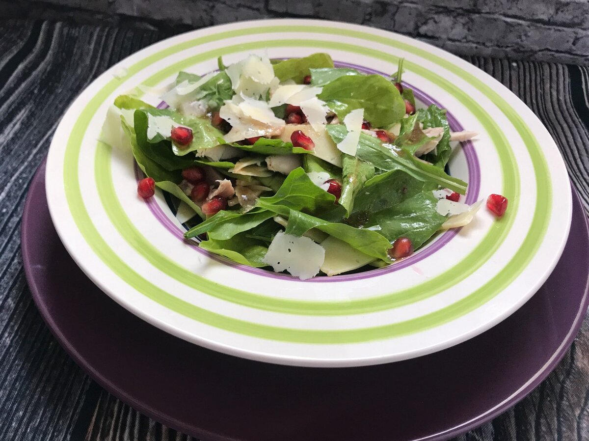 Выложить салат в сервировочную тарелку, посыпать хлопьями сыра и зернами граната. Полить соусом и подавать.