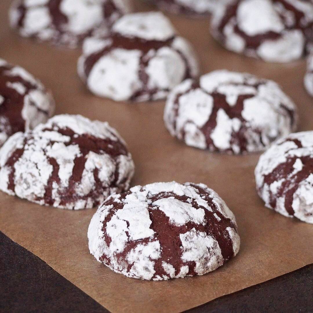 Ингредиенты: Приготовление: В миску просеять муку, какао, сахарную пудру, добавить щепотку соли, разрыхлитель и все хорошо перемешать. Масло комнатной температуры нарезать на кубики и добавить к сухой смеси, начать взбивать миксером на низкой скорости. По очереди добавить яйца по одному, продолжая взбивать. Получится липкая шоколадная масса средней густоты. Сразу не лепить, убрать в морозильник на 10-15мин После морозильника сформировать небольшие шарики, обвалять их в сахарной пудре и выложить на противень, застеленный пергаментом. Оставляйте расстояние между печеньем, оно увеличится в размерах. Выпекать при 150° около 10мин. Не пересушите, готовность можно проверить зубочисткой. Сначала печенье будет мягким, нужно дать ему немного остыть и подавать к столу.
