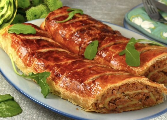 Говяжий фарш с томатной пастой, овощами и специями — отличная начинка для слоёного теста. Благодаря готовому тесту этот несладкий штрудель можно приготовить довольно быстро, поэтому блюдо идеально для семейного ужина после рабочего дня или на выходные. Продукты (на 6 порций)Тесто слоёное бездрожжевое - 300 гФарш говяжий - 500 гЛук репчатый - 100 г (1 шт.)Яйцо - 1 шт.Томатная паста - 30 г (2 ст. ложки)Сухари панировочные - 20 г (2 ст. ложки)Чеснок - 2-3 зубчикаОрегано сушёный - 1 ст. ложкаСоль - 1/2 ч. ложкиПерец чёрный молотый - 1/5 ч. ложкиМасло оливковое (для жарки) - 2-3 ст. ложки Штрудель с мясным фаршем Подготовьте все ингредиенты для мясного штруделя. Томатную пасту можно заменить томатным соусом или обычным кетчупом. Фарш предварительно разморозьте в холодильнике (говяжий можно заменить свино-говяжьим или свиным). Тесто тоже предварительно разморозьте. Чеснок и лук очистите. Сковороду разогрейте, влейте оливковое масло (1 ст. ложка), выложите фарш и обжарьте, постоянно помешив