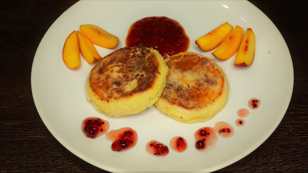 Приготовление: В творог добавляем манку, сахар, соль, ванилин и всё тщательно перемешиваем. Вбиваем яйцо и всё хорошо разминаем вилкой или толкушкой. Полученную творожную массу отправляем в холодильник на 1 час. Спустя время формируем сырники. Поверхность стола посыпаем мукой. Сначала формируем из творога круг, а из круга шайбочки при помощи ножа. На разогретую сковороду вливаем 1 ч.л. растительного масла, смазываем сковороду и выкладываем поджариваться сырники. Обжариваем с обеих сторон. Далее на пергаментную бумагу выкладываем сырники и отправляем в духовку на 10 минут при 180С. Вкуснейшие сырники готовы! Рецепт: Творог - 400 гр Манка - 1 ст.л. Сахар - 2 ч.л. Ванильный сахар - 1 ч.л. Соль Яйцо - 1 шт Мука Масло растительное Варенье смородины Фрукты Ссылка на видео рецепт: