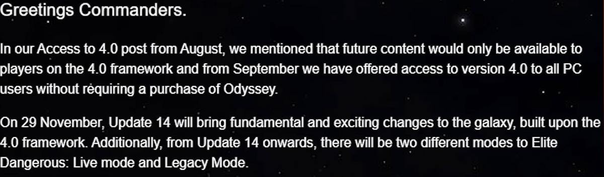 Через несколько дней грядет крупное обновление. В сентябре месяце писал статью о различных версиях игры (3.8 4.0 и Odyssey) и тут снова изменения. Если просто в двух словах, то версия 3.8 замораживается и больше нет никаких нововведений там не будет. Те кто остался на консолях и не перенес свой аккаунт - увы. Ваша версия игры более не будет развиваться. Появится 2 режима новых. Режим Live (версии 4.0 и Odessey) будет развиваться в плане сюжета, будут игровые активности, фронтиры будут следить чтобы игрокам было не скучно играть. В 14 обновлении будет что-то грандиозное и завораживающее (так говорят сами фронтиры) и на этом не остановятся они. Уже распланированы 15 и 16 обновления, но информация будет известна об этих обновлениях только в 2023 году. Режим Legacy это другое название версии игры 3.8. Некая песочница, которая, начиная с 14 обновления, не будет связанна с версиями 4.0 и Odessey. Если сейчас играя в любой версии игры - прогресс сохранялся и там и там, то с 29 ноября такого