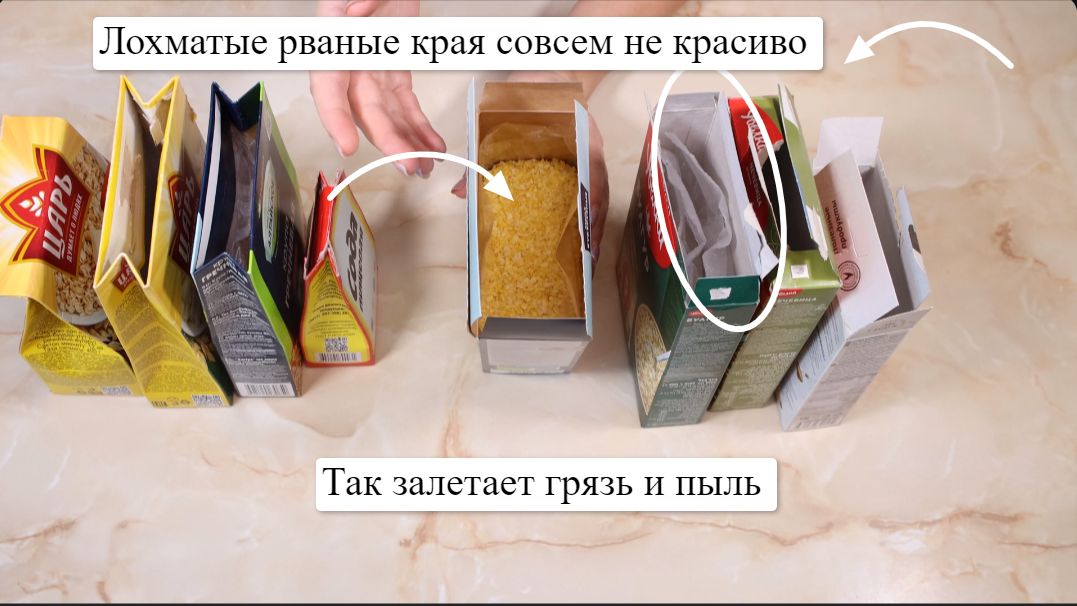 Приветствую, вы на канале Марина Жукова — канале о бюджетной чистоте и порядке. Хочу поделиться небольшой хитростью, благодаря которой, коробки с открытыми крупами будут храниться красиво и удобно. В крупу больше не залетит ни грязь, ни пыль. Раньше, коробки с крупами я просто открывала по отрывным линиям, и далее коробка оставалась просто открытой. В нее постоянно залетала грязь, она вбирала влагу. Теперь я поступаю иначе. После открытия коробки, я аккуратно заворачиваю края картонной коробки внутрь. Как это выглядит: С боковых сторон вдавите картонные «бока» внутрь коробки. И аккуратно придавите коробку руками по бокам чтобы она выровнялась. Края подогните. Картонные квадратики по бокам можно срезать, в можно заправить внутрь коробки. И далее перегнуть открытые края чтоб воздух не попадал внутрь. Зафиксировать закрытое положение можно канцелярской скрепкой, прищепкой. При необходимости открываете коробку, и, через острое горлышко насыпаете нужное количество крупы. Аналогично складыв