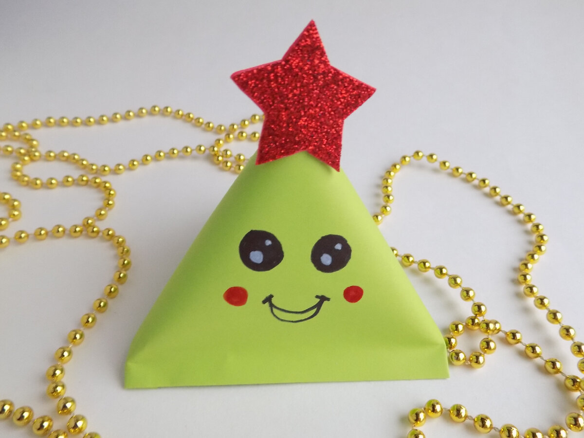 Небольшой сюрприз к Новому году можно преподнести близкому человеку оригинальным способом. Например, попробуйте сделать упаковку в виде елочки по сегодняшнему мастер-классу. Для изготовления такой упаковки приготовим: - светло-зеленую бумагу; - красный блестящий фоамиран; - клей с ножницами; - линейку с простым карандашом; - фломастеры красного, белого, черного цвета. Сначала вырежем прямоугольник из светло-зеленой бумаги. Его размер составляет 21х10,5 см. Длинные его стороны загибаем примерно на 5 мм. Теперь воспользуемся клеевым карандашом. Смазываем клеем загнутые края, а также одну короткую сторону заготовки. Соединяем короткие стороны и склеиваем их. Наша заготовка приобрела форму кольца. Далее требуется склеить между собой другие стороны, которые имеют узкие загнутые края. Сначала это делаем с одной стороны. Оставшиеся стороны требуется соединить между собой так, чтобы получилось ребро, расположенное под прямым углом к ранее сделанному. Но перед этим не забываем положить в