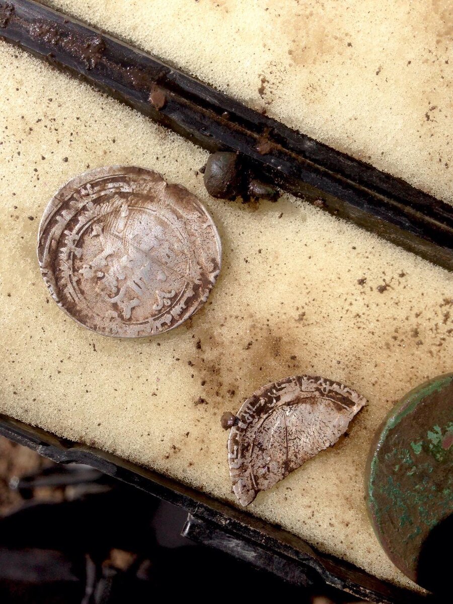 Приехали с напарником в поле, огромное такое, краев не видать. Бродили по нему, монетки выкапывали, обломки всякие из цветнины. Я добралась до противоположного края, смотрю земля черная в углу, чернозем прям. Стала бродить с металлоискстелем, а там звенит все, сигналы железа вперемешку с цветными. Я растерялась, тогда я еще не понимала, что это, и как это выкапывать. Тут Гена по рации говорит, что нет тут ничего, да и домой пора. Собрались и уехали. На следующий день планирую копать одна, и решила опять на это поле выехать. Не близко оно, почти 200 км от дома. Еду, и иду принципиально в тот край, где все звенело. Вдруг четкий звонок, и я выкапываю серебряную монету! Очень старинную, куфический дирхем, находке тысяча лет. А рядом еще половинка. Мне б тогда покрутиться там подольше, углубиться поглубже, но опыта по копу домонгола было маловато. И я побрела дальше по распашке. Попался двойственный сигнал, выкапываю-опять серебро, и что-то древнее, вижу, что украшение, а какое непонятно