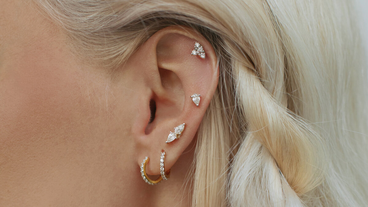 Серьги для пирсинга – это всегда миниатюрные изделия, которые может быть не совсем удобно надевать без посторонней помощи. Особенно если вы имеете дело с таким видом украшений впервые. Разрабатывая коллекцию Piercing мы консультировались с практикующими пирсерами и знаем о пирсинг все! Из-за своего размера детали серьги можно уронить, поэтому будьте очень внимательны. Берите серьги сухими руками, предварительно не наносите на руки крем или масло. Кроме того, мы не рекомендуем надевать серьги над раковиной, на улице и в других общественных местах, где части серьги могут упасть и потеряться. Делайте это перед зеркалом и не спешите. Если вы меняете украшение над раковиной, то обязательно прикрывайте сток салфеткой или полотенцем. Серьга-накрутка состоит из двух частей. Пин – это задняя часть изделия, которая вставляется в ухо с обратной стороны. Накрутка – это передняя часть, которая вкручивается в пин с внешней стороны уха. Пошаговая инструкция 1. Вставьте пин в прокол с обратной сторон