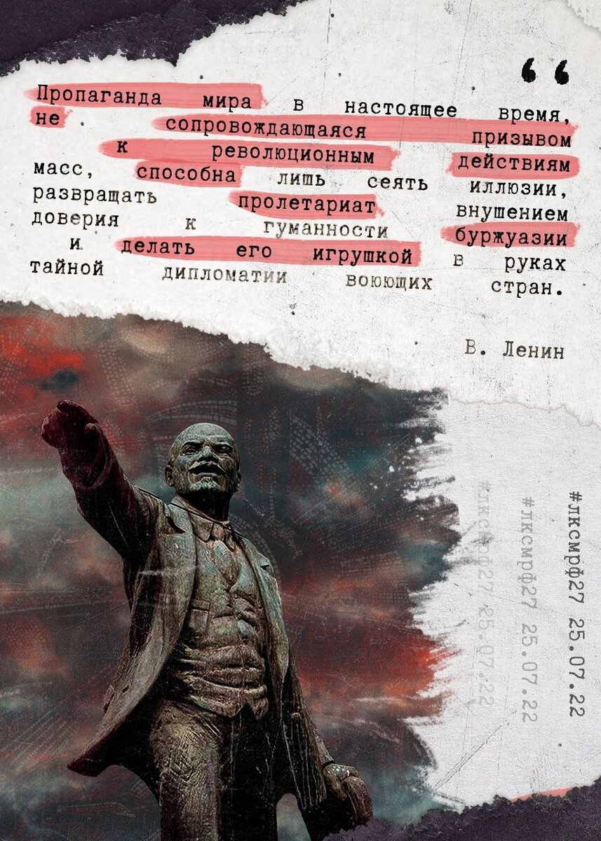 «Превращение империалистической войны в гражданскую войну есть единственно правильный пролетарский лозунг, указываемый опытом Коммуны, намеченный Базельской (1912 г.) резолюцией и вытекающий из всех условий империалистической войны между высокоразвитыми буржуазными странами. Как бы не казались велики трудности такого превращения в ту или иную минуту, социалисты никогда не откажутся от систематической настойчивой, неуклонной подготовительной работы в этом направлении, раз война стала фактом» (Ленин, «Война и российская социал-демократия»)……