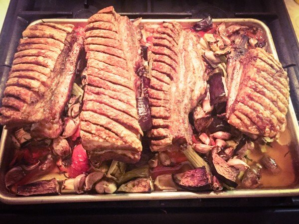 1 свиная корейка С кожей весом около 1,8 кг с костью (или 1,4 кг корейки без кости). Так указано в рецепте. Но у нас не продается корейка с кожей. Мы всегда берем грудинку с кожей.. такую, чтоб в ней было минимум жира. На рынке всегда большой выбор грудинки, так что найти такое мясо не проблема. Очень важно, чтоб оно было именно с кожей!