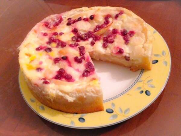 1. Приготовим тесто. Для этого сливочное масло размешать с сахаром, добавить 2 желтка, соль и муку. 2. Замесить тесто. Сформировать комок и охладить его минут 10–15. 3. Охлажденное тесто размять в форме для запекания, смазанной маслом или выложенной пергаментной бумагой для запекания. Проколоть вилкой, насыпать горох на бумагу для выпечки. Без этого дно вздуется даже проколотое вилкой. 4. Выпекать 15 минут в духовке. 5. Начинка делается так: яблоки очистить и нарезать дольками. Чтобы яблоки не потемнели, полить их лимонным соком. 6. Обжаривать яблоки в небольшом количестве масла до золотистой корочки. 7. Яблоки выложить на тесто и сверху посыпать замороженной брусникой, хот