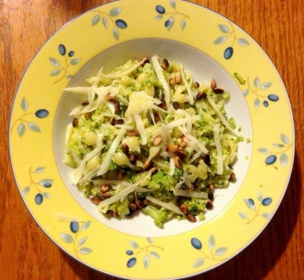 Слив воду с макарон и брокколи, добавляем туда наш соус, хорошенько перемешиваем и раскладываем на тарелки, посыпаем орешками и сыром.