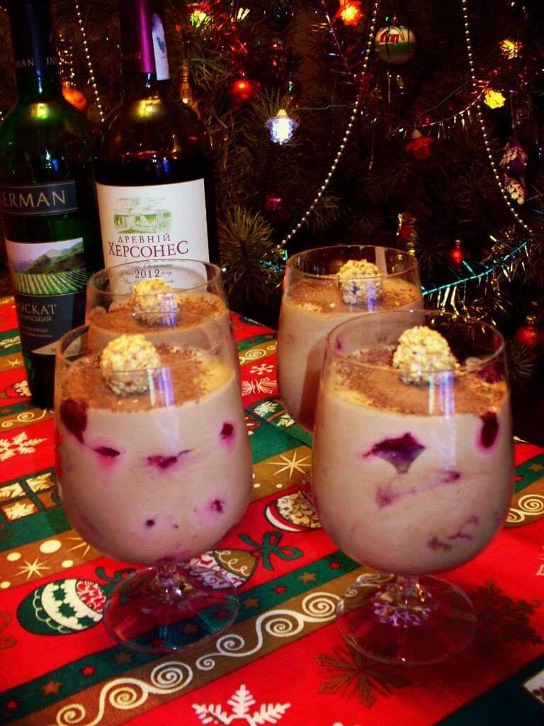 Привет! Начинаем готовиться к новому году! Вот рецепт десерта, который я разработала восемь лет назад. Попробуйте заранее, чтобы решить, подходит ли он к вашему праздничному столу. Неимоверно вкусный, праздничный, воздушный десерт, который с успехом может заменить торт) * 400 гр замороженной вишни, без косточек, выложить в кастрюльку, всыпать стакан сахара, дать слегка разморозиться и пустить сок, влить стакан красного полусладкого вина, столовую ложку рома. Вишнёвую смесь варить на небольшом огне 5 - 7 минут. Полученный сок слить и остудить. Вишню откинуть на сито и остудить. * 100 гр чёрного шоколада поломать, сложить в кастрюлю и добавить столовую ложку свежезаваренного чёрного чая, без сахара. Растопить шоколад на водяной бане, постоянно помешивая, до получения однородной, шелковистой массы. * 4 небольших желтка от свежих куриных яиц (если яйца крупные, то 2 - 3 желтка), 100 гр сахара - взбить венчиком, растерев до получения однородной, пышной массы. Я делаю это на водяной бане