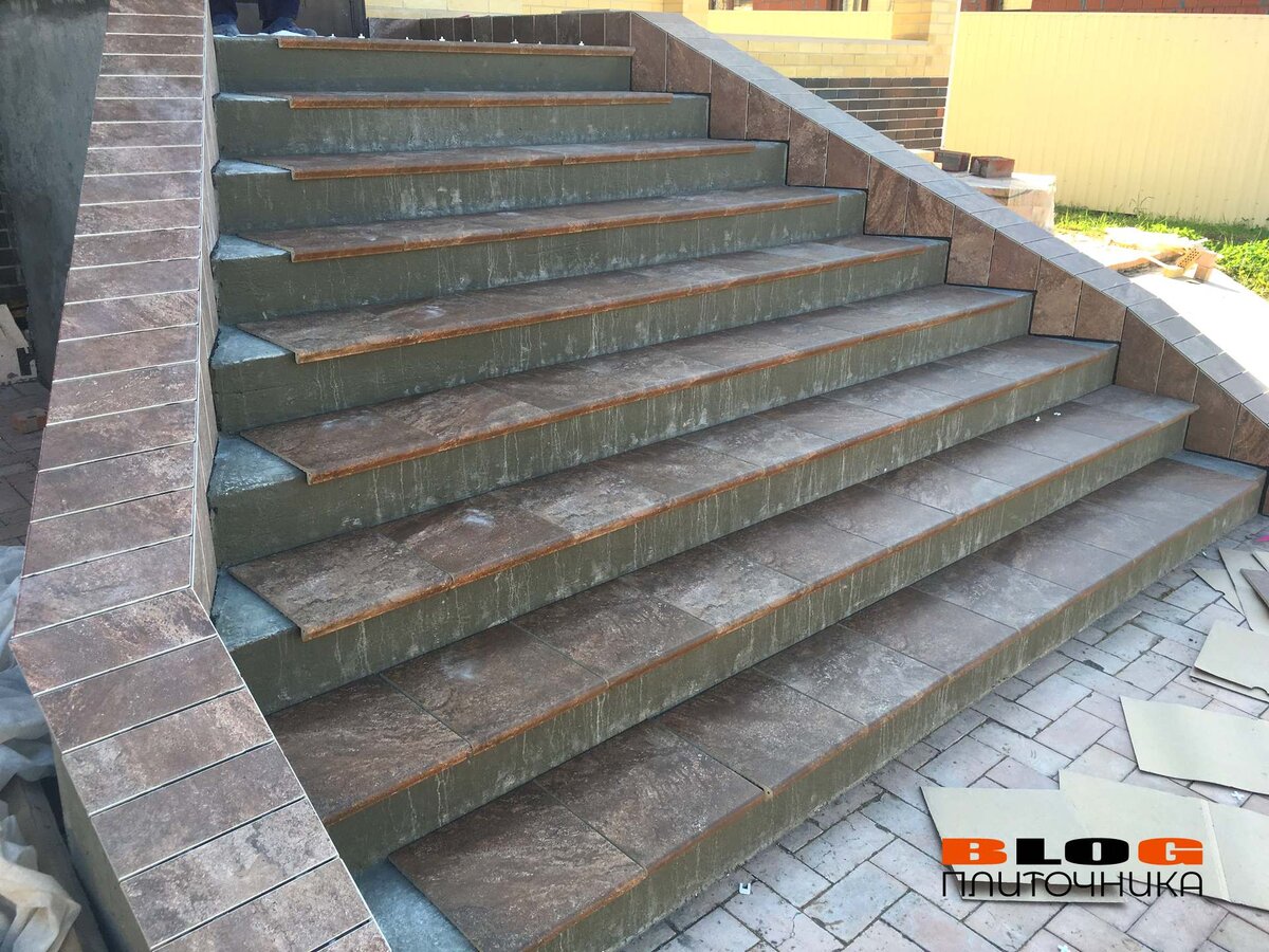 Приступил к работе во второй половине дня, когда жара поутихла. Раскладка насухо Первым делом повторная раскладка насухо. Определяемся с распределением оттенков. Утверждаем с заказчиком. * Тогда-то и возник вопрос по поводу швов. Изначально они должны были стыковаться. Как думаете почему я настаивал на том, чтобы сделать в разбег? Не по правилам Также, как я и говорил ранее (на этапе шлифовки лестницы) глубина ступеней была больше, чем нужно. Известно, что по технологии подступёнок должен заводиться за капинос, как бы нависать, как на этом примере: но тогда глубина ступени должна позволять это. А у нас не позволяла: Поэтому мы делали иначе. Нарезка + раскладка насухо + наметка швов плитки у площадки крыльца Потом по намеченным швам намного удобнее укладывать (отлично видно, что кладка не уходит никуда). Резка, шлифовка и доработка углового примыкания: С этим пришлось повозиться - пришлось неплохо побегать до станка, бормашинки и обратно). Облицовка площадки крыльца Сподручнее в начале