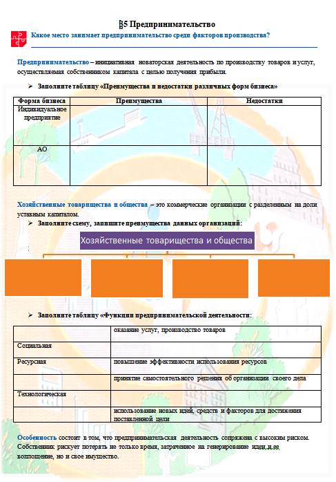 Рабочий лист "Предпринимательство". Обществознание 8 кл. (Р.С.Гринберг, Г.Э.Королёва, О.Б.Соболева под редакцией В.А.Тишкова).