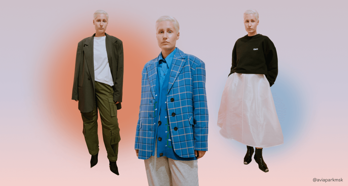 Многослойный образ, если хочется экспериментов. Рубашка, кардиган и жакет в синей гамме — буйство принтов и текстур. Усмиряется весь этот карнавал базовыми серыми трениками и ботильонами на каблуке. Понимаем, что аутфит не для каждого, но кто решится — соберёт все взгляды.