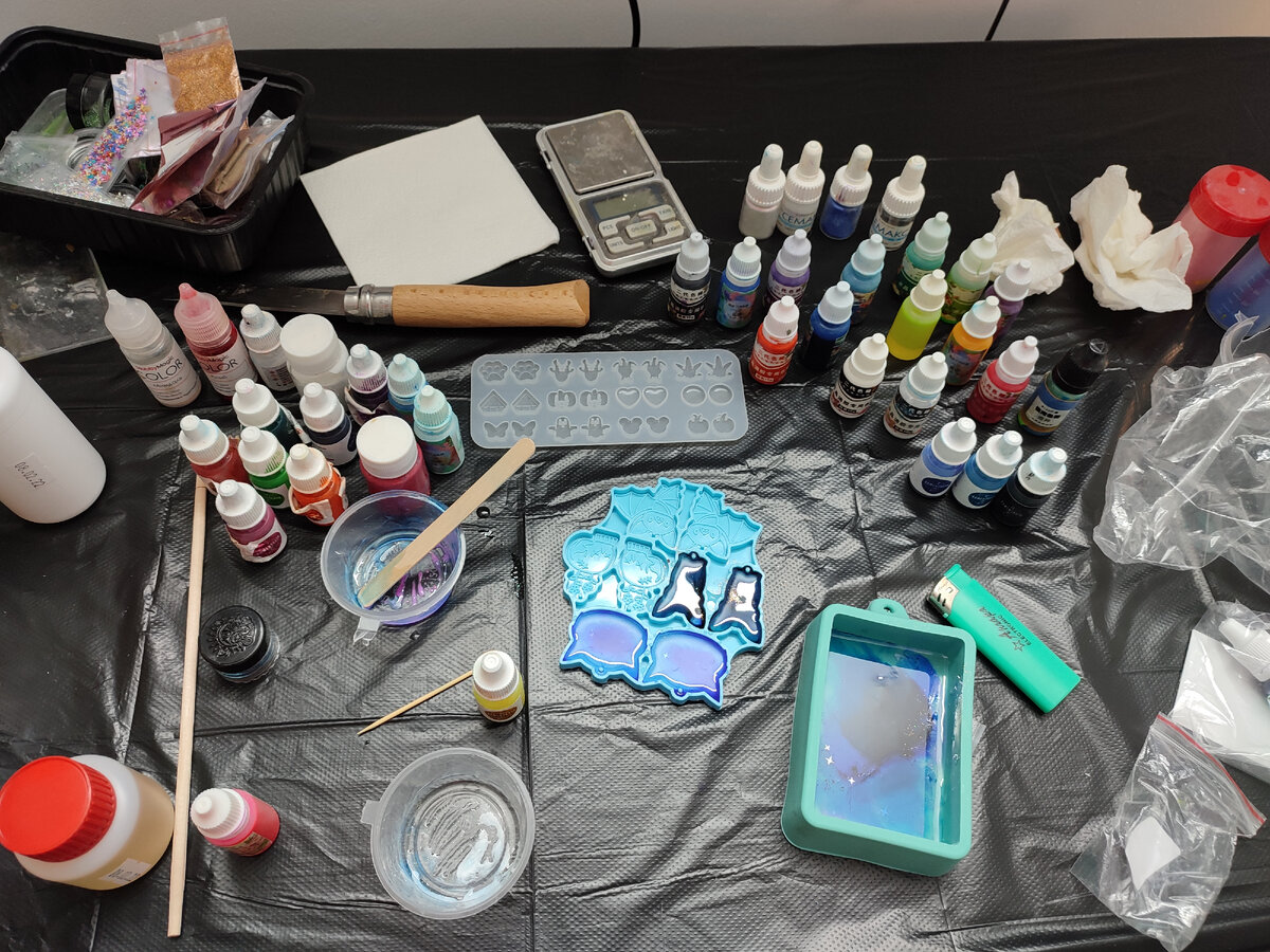 Я не занималась эпоксидкой наверное более двух лет. Сложно раскачаться и сесть за работу, даже не смотря на то, что по весне купила пару наборов — один для рисования смолой, другой для украшений. Но сегодня ночью не спалось, я таки разобрала на столе, закрыла его пленкой и приступила к творчеству. Распотрошила как раз набор для рисования. Такая смола плохо подходит для молдов — слишком густая. Но мне хотелось сделать космос за один прием и не хотелось ночью сложных расчетов, а эта смешивается 2:1. Заодно я разобрала коробку с красителями. Обычно они конечно стояли строго вертикально, но за несколько лет все опрокинулось, перемешалось и часть испортилась. Красители на фото выше из набора, они лежали отдельно и их я так и не попробовала. Показались очень густыми, а с такими надо осторожнее. Эта стопка красителей на выброс. Каменская для Петри-арта были в целом неплохи, но уж очень дорогие. Плюс белый кончился и я его намешивала сама. Если бы у меня были сухие пигменты без блёсток, чернил