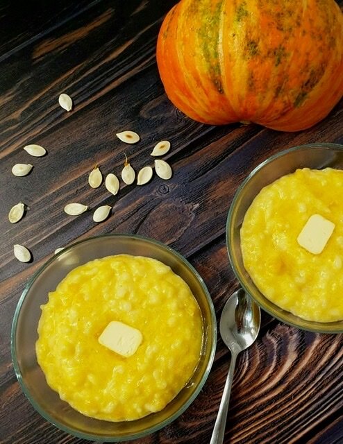 - Подают кашу рисовую с тыквой, заправив сливочным маслом.