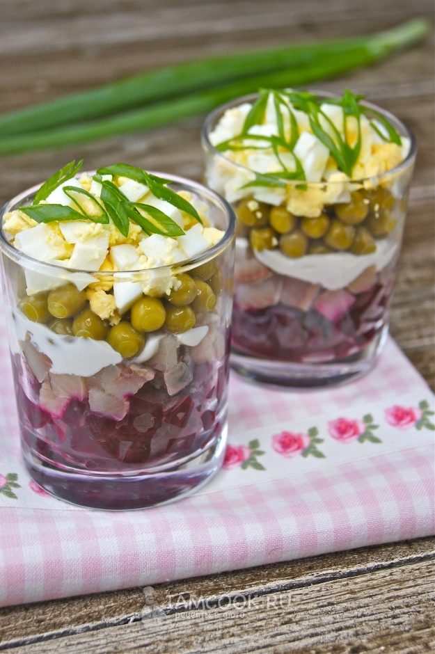 Ингредиенты: Свекла средняя 1 шт Лук 1 шт Пучок петрушки Филе селёдки 1 шт Зелёный консервированный горошек 1 маленькая банка Яйца 2 шт Лук зелёный для украшения Перец чёрный по вкусу Майонез Приготовление: Свеклу нарезать кубиками. Селедку также режем кубиком. Лук нарезать полукольцами. Уложить слоями в креманки. Сначала свекла, затем лук, потом селёдка и горошек. Каждый слой можно промазывать майонезом. Сверху украшаем вареным яйцом, предварительно нарезав его кубиком. И посыпаем зелёным луком. Приятного аппетита :) Не забудьте подписаться на мой канал, мне будет приятно, а Вам интересно :)