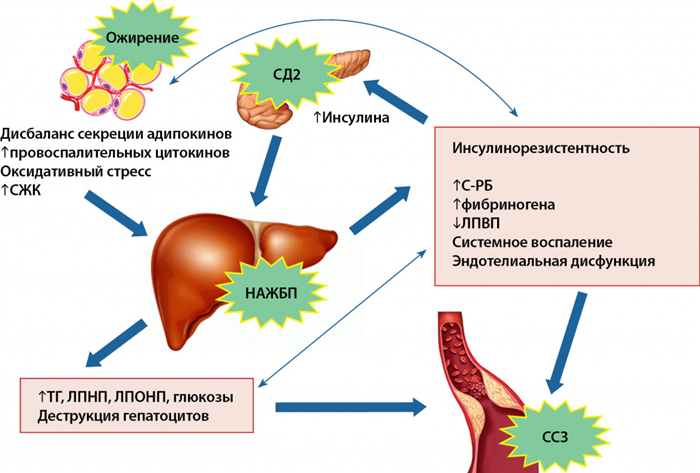 Присутствие патологии приводит к развитию сахарного диабета и ряда сердечно-сосудистых болезней. Нарушение циркуляции крови связано с неспособностью артериальных сосудов к расширению. На фоне ожирения, изменения активности свертывания и инсулинорезистентности начинает формироваться атеросклероз.