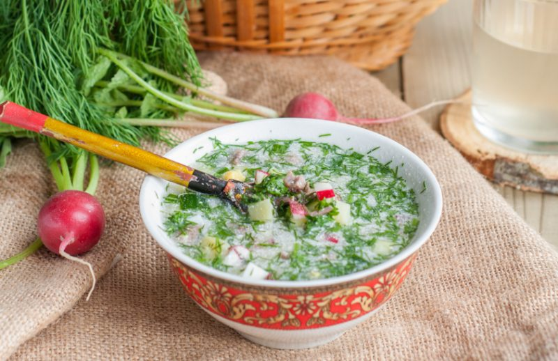 Разложите окрошку по тарелкам, посолите и поперчите по вкусу. Хорошо перемешайте и залейте кефиром.