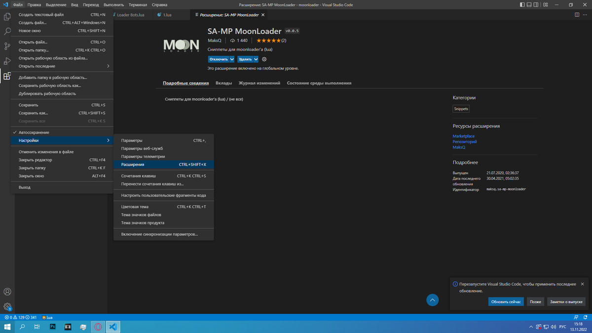 Всем привет. Сегодня рассмотрим настройку VS Code для дальнейшего написания скриптов. 1)Файл - настройки - расширения. 2)Появится поиск расширений для VS Code. Вбиваем в поиске и устанавливаем все тоже самое что у меня. 3)После скачивания, выбираем папку с ГТА самп в которой будем писать скрипты. Файл - Открыть папку - C:\Ваша ГТА\moonloader жмём Выбор папки. 4)Далее нажимаем проводник в левом верхнем углу. Появляется папка moonloader с вашими скриптами. 5)Нажимает в пустом месте правой кнопкой мыши и создаем файл. 6) Пишем название вашего будущего скрипта, скрипт должен заканчиваться на .lua 7)В итоге получаем небольшое окно imgui - есть кнопка и два текста.
