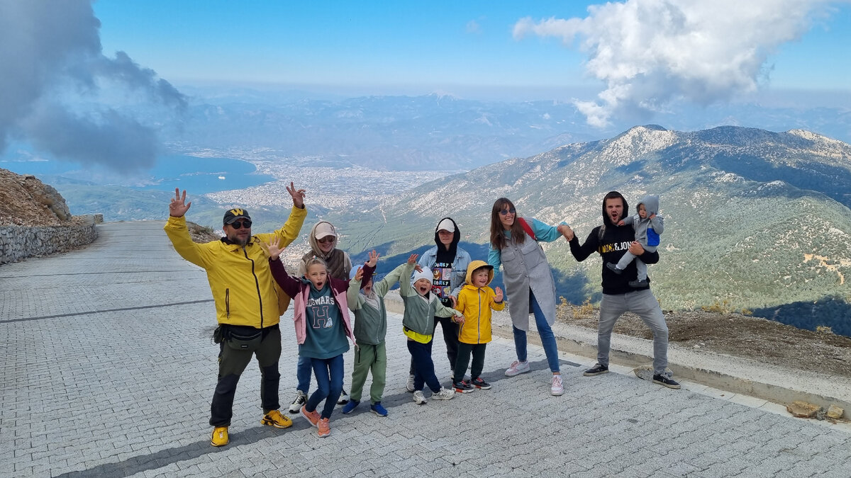 После Фетхие в нашу программу входило поехать в Каш, но планы изменились, когда на стоянку в Фетхие приехали Стас и Настя с тремя очаровательными детьми, которых мы знали заочно по YouTube. С которыми мы простояли ещё 3 дня. На третий день к нам приехала, тоже совершенно случайно, семья из трех человек Сергей Лиля и Георгий из Галенджека. Мы так не хотели расставаться, что отменили все планы и выдвинулись в Олюдениз всей безумной толпой: 6 взрослых и 5 детей. На пляже Бельджекиз мы переночевать две ночи, а утром поехали на подъемник на гору Бададат, всем большим составом. Первый подъём 1200м, здесь мы дожидались в ресторане следующего подъёмника, не в сезон он ходит первые 15 мин каждого часа. Следующая высота 1700м, здесь уже поинтересней: красивый мостик, где можно гулять и любоваться видами. На высоту 1900 подъемник ещё не запустили, поднимались пешком, так как водитель автобуса сказал нам, что возит только парашютистов. Но подобрал нас, на полпути. А потом так же повёз нас