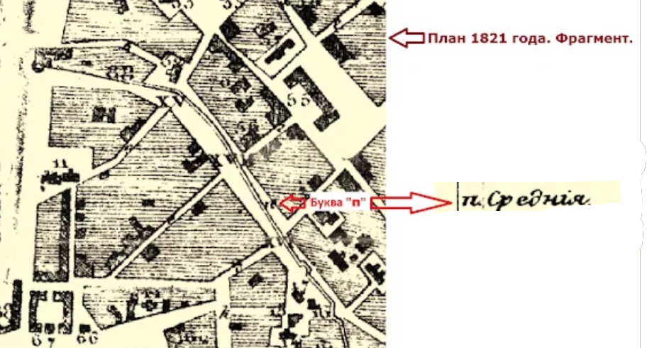 Первым планом Пскова, на котором появились названия улиц, видимо, является план 1821 года. На этом плане кириллическими буквами от А до Ш обозначены 25 улиц в междуречье и на Запсковье (Улицы Завеличья подписаны прямо на плане). Под буквой П – улица "Среднiя".