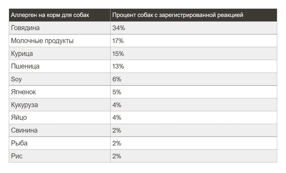 В том же обзоре BMC Veterinary Research мы находим перечень продуктов, на которые у собак чаще бывают аллергические реакции: