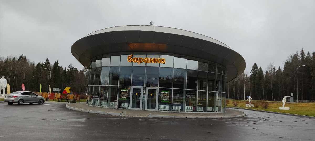 Единственное примечательное место на этом отрезке – знаменитое на трассе кафе «Баранка», о котором пишут почти все путешественники. Кафе действительно оказалось выше всяких похвал. Кормят вкусно и недорого. Отличной оказалось и коллекция советской парковой скульптуры, представленная вокруг павильона. Редко где встретишь такое собрание, да и еще и в открытом доступе. К сожалению, женщины с веслом, горнисты и барабанщики пошли на слом еще в 1990-е годы, поэтому отрадно знать что кто-то это сохранил.