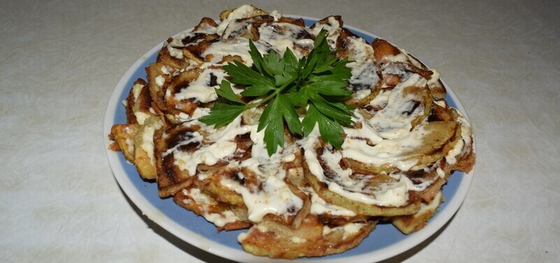 В летний период, когда количество овощей опережает наши потребности. Когда их уже частично переработали в зимние заготовки, а частично съели. Предлагаю вкусный и легкий рецепт жареных кабачков. Порции: –+4 Ингредиенты: Очищаем кабачок от кожуры. Я использую «экономку». Она действительно экономит время, быстро и качественно очищая наши овощи. Удаляем из кабачка сердцевину с семечками. Нарезаем дольками примерно по 0,7 см. Готовим соус. Для этого натираем зубчики чеснока на мелкой терке или мелко нарезаем ножом. Смешиваем майонез с чесноком. Добавляем щепотку соли, и все тщательно перемешиваем. Смешиваем муку с солью. Обваливаем пластинки кабачка в муке. В сковороде слегка прогреваем подсолнечное масло. Обжариваем пластинки кабачка с обеих сторон по 2-3 минуты до золотистого цвета. Обжаренные кусочки кабачка выкладываем на бумажные салфетки, чтобы убрать лишнее масло. Смазываем каждый кусочек нашим соусом из майонеза и чеснока. Закуска из кабачков готова. Ее можно есть как самостоятельно
