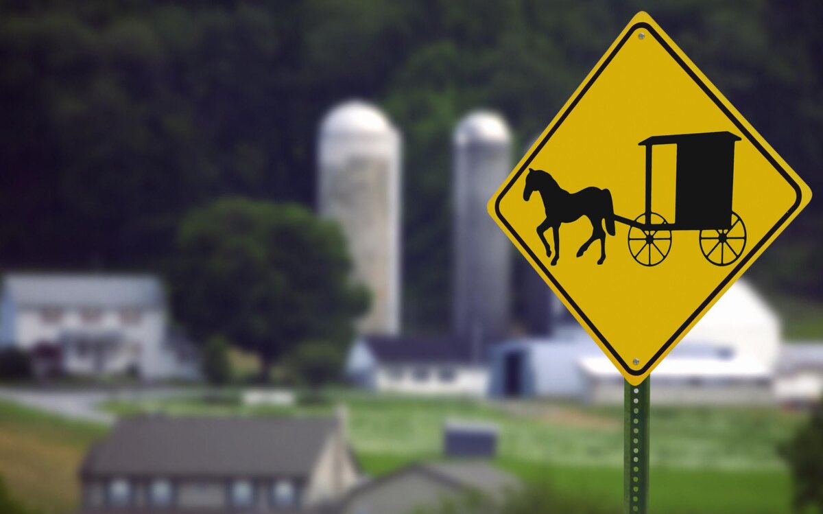 Дорожный знак, мягко говоря, неожиданный; проезжая по процветающей сельской части Северной Америки, последнее, что вы ожидаете увидеть рядом с шоссе, - это желтый ромбовидный дорожный знак с лошадью и коляской посередине! Следите за лошадьми и колясками на дороге? Что это?