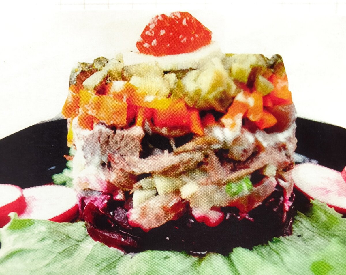 Для этого блюда нам понадобится: Телятина отварная - 300 гр. Филе слабосоленой сельди - 1шт Зелёное яблоко - 1шт. Морковь - 1шт. Свекла - 1 шт. Сельдерей - 1 шт. Солёные или маринованные огурцы - 2 шт. Маринованные грибы - 4-5 шт. Для соуса: Раст. масло - 6-7 ст. л. Горчица - 1ч.л. Хрен столов. - 1/2 ч. л. Сок лимона, соль, чёрный перец. Для украшения: Листья салата, 2 ч. л. Красной икры, 1 варёное яйцо, редис. Приятного аппетита!