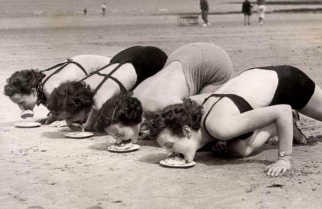 1. На этой фотографии 1937 года посетители пляжа участвуют в конкурсе по поеданию пирогов «без рук». Конкурс выглядит весьма соревновательным, участники ныряют лицом вперед в свои пироги. Выражение напряженной концентрации на лице женщины на переднем плане бесценно.
